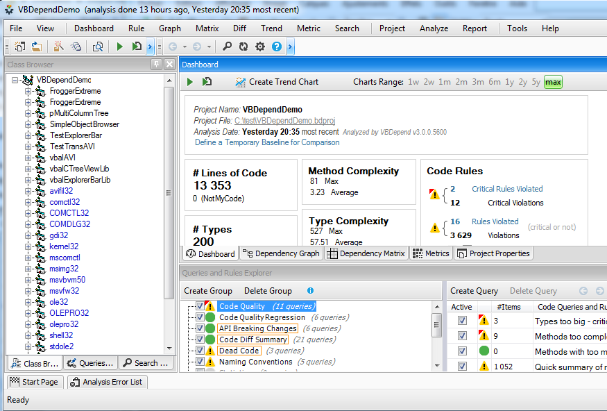 - Once the analysis done, the result is displayed in the VisualVBDepend.exe UI.